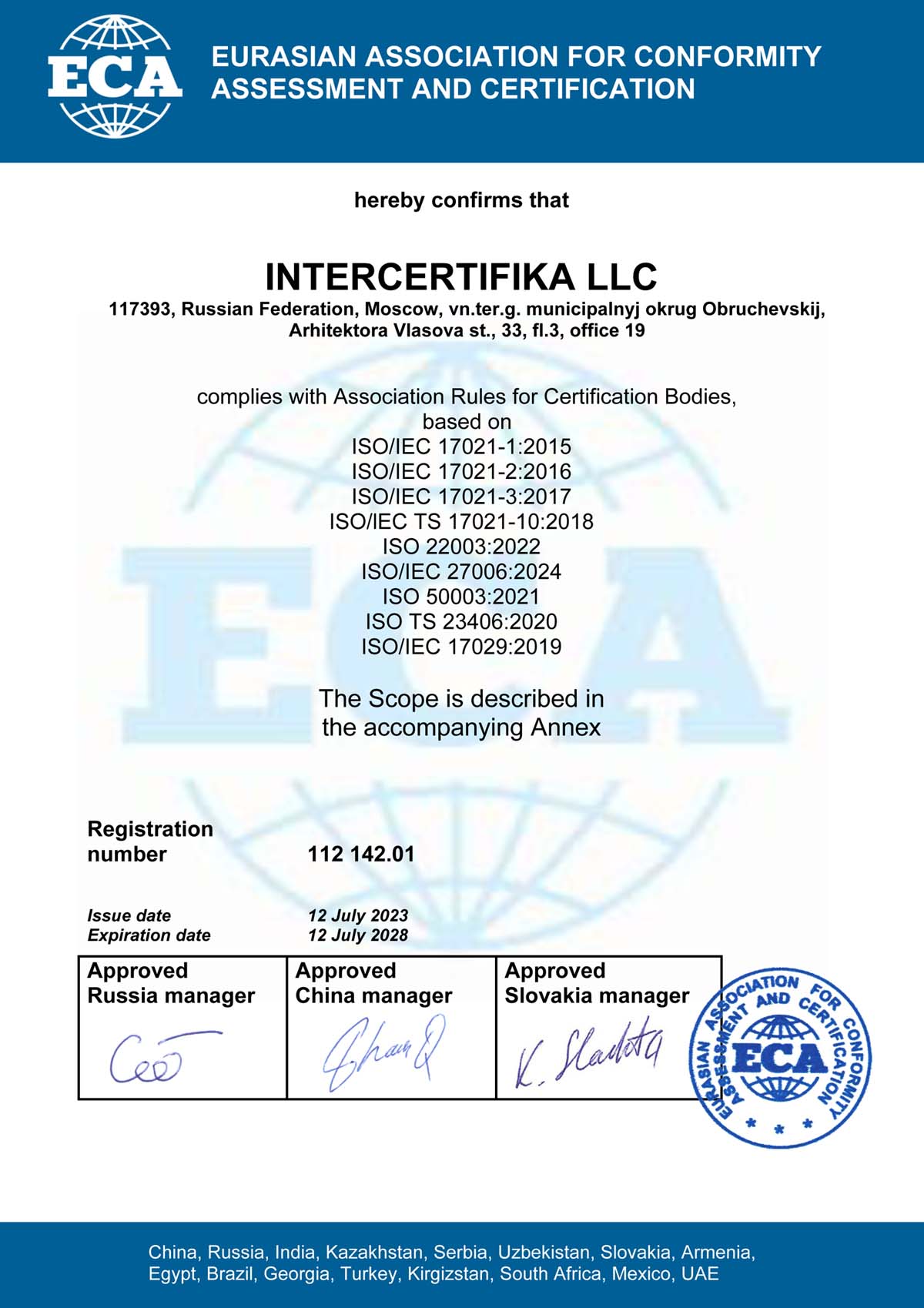 В 2024 г. ООО «ИНТЕРСЕРТИФИКА» получило одобрение в рамках Евразийской Ассоциации по оценке соответствия и сертификации (ЕСА) и стало подписантом MLA-соглашения о взаимном признании сертификатов.